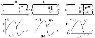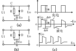 图一是二极管限幅电路,电路(a)是并联单向限同上电路,电路(b)是串联单向限幅电路;电路(C)是双向限幅电路,三种电路的工作原理相同,现以电路(C)说明:分析电路原理时认为二极管的正向电阻Rf为零反向电阻Rr为无限大,当Ui>E1时,D1导通,则Uo=E1;反之,当Ui<E2时,D2导通,则Uo=-E2;而当E2〈Ui<E1时,D1和D2截止,Uo随Ui而改变,故输出波如图(C)所示。