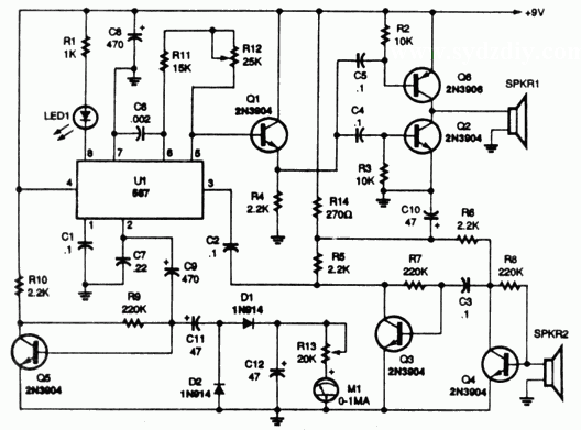 图中SPKR1和SPKR2均为压电高音喇叭,用来发送和接收超声波。电路核心为567锁相环集成电路,完成发送和接收的双重功能。第⑤脚为方波输出,其频率由R12调整,送至Q1后,由其发射极耦合至由Q2和Q6组成的功放部分,最后推动SPKR1向外送出超声波。接收超声波由另一只喇叭SPKR2完成,经Q3和Q4的两级高增益放大后送至第③脚,只要接收信号频率在567的带宽之内,LEDl便可发光。