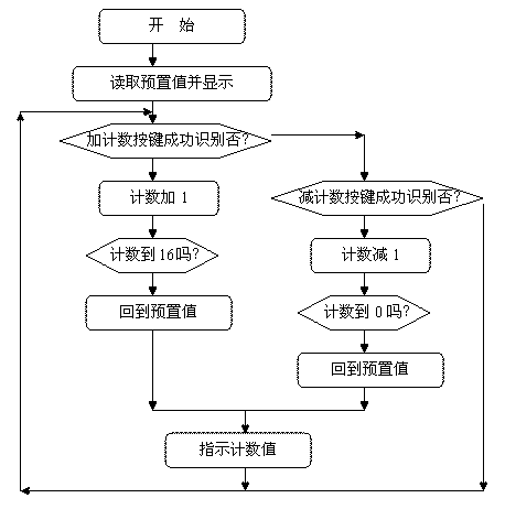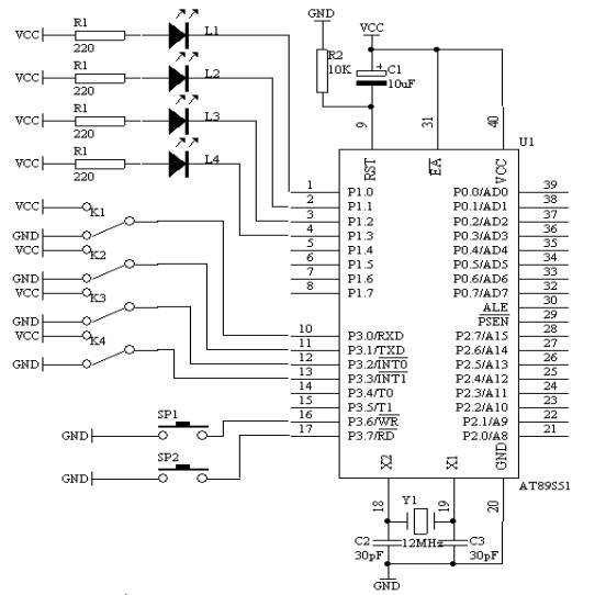 利用AT89S51单片机的P1.0-P1.3接四个发光二极管L1-L4,用来指示当前计数的数据;用P1.4-P1.7作为预置数据的输入端,接四个拨动开关K1-K4,用P3.6/WR和P3.7/RD端口接两个轻触开关,用来作加计数和减计数开关。具体的电路原理图如下图所示