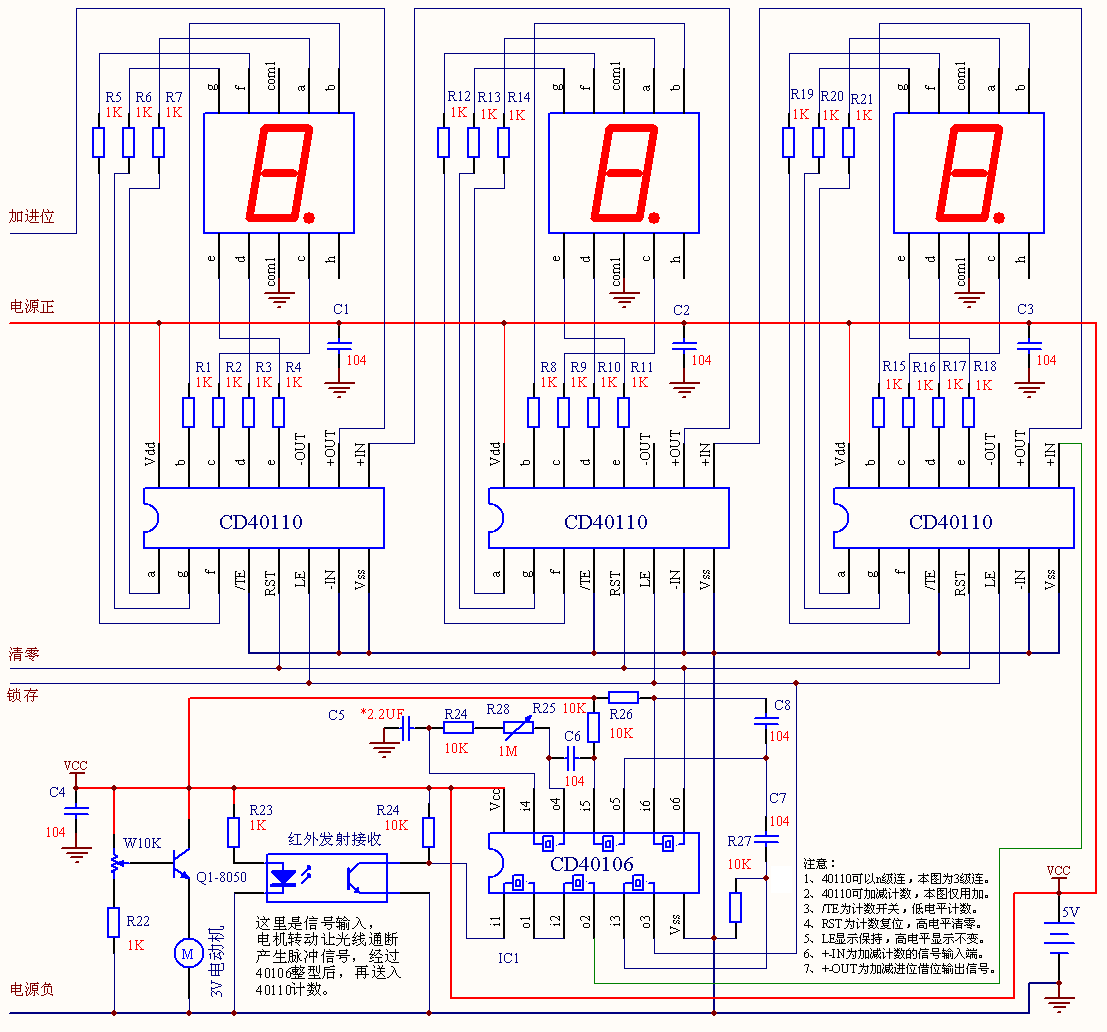 因此,整个过程: …… → 用几毫秒计数复位(显示上次的数) → 长达1秒的计数(显示上次的数)→ 周期到了用几毫秒读取本次计数并锁存 → 用几毫秒计数器复位(显示上次的数)→ ……,如此周而复始,这样我就可以看到延时一个周期的电动机的实时转速。我们将同期调节到1秒零几个毫秒,这样,我们测得的数据就每秒钟转多少圈。如果我们将CD40110的锁存脚LE改接成低电平,将复位脚RST接一个手工复位开关,就成了一个常用的电子计数器。